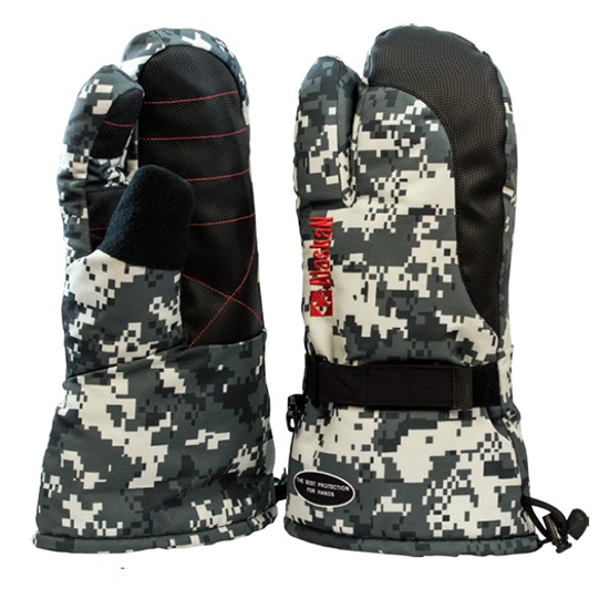 Alaskan Twofingers Camo – puikios kumštinės pirštinės žvejybai ar medžioklei žiemos metu, šiltos, patogios, turi anatominį pjūvį. Mažų objektų manipuliavimo patogumui išskiriamas rodomasis pirštas. Delno dalis pagaminta iš poliuretano. Šios medžiagos ypatybė yra tai, kad ji neleis, kad kumštis būtų drėgnas, net jei paimsi žuvį į rankas. Ant nykščio yra vilnos „sala” (nosies), ant riešo – pločio reguliavimas.