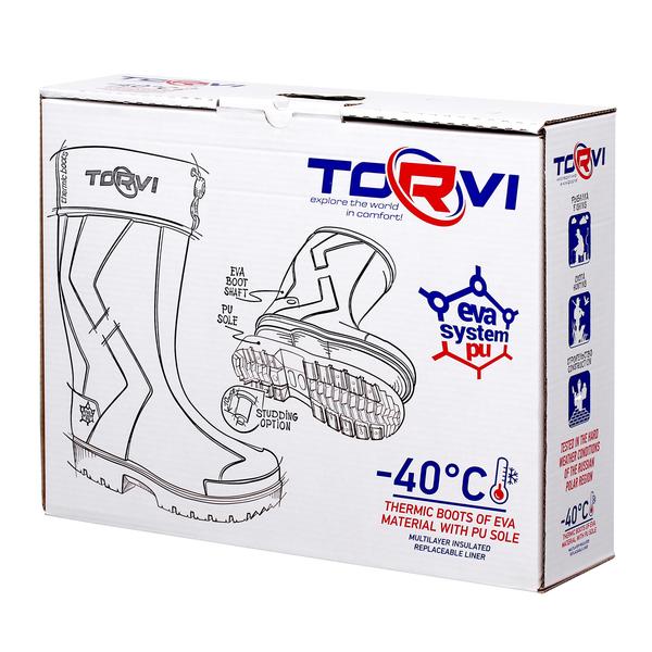 Kadangi batai EVA + PU Torvi T -40 ° C yra žieminiai ir skirti itin žemai temperatūrai, jie yra su daugiasluoksnėmis izoliuotais įdėklais. Jie sukurti pagal šiuolaikines šilumą taupančias technologijas, suteikiančias ne tik šilumą, bet ir komfortą kojoms, dėka specialios kūno garų šalinimo sistemos.