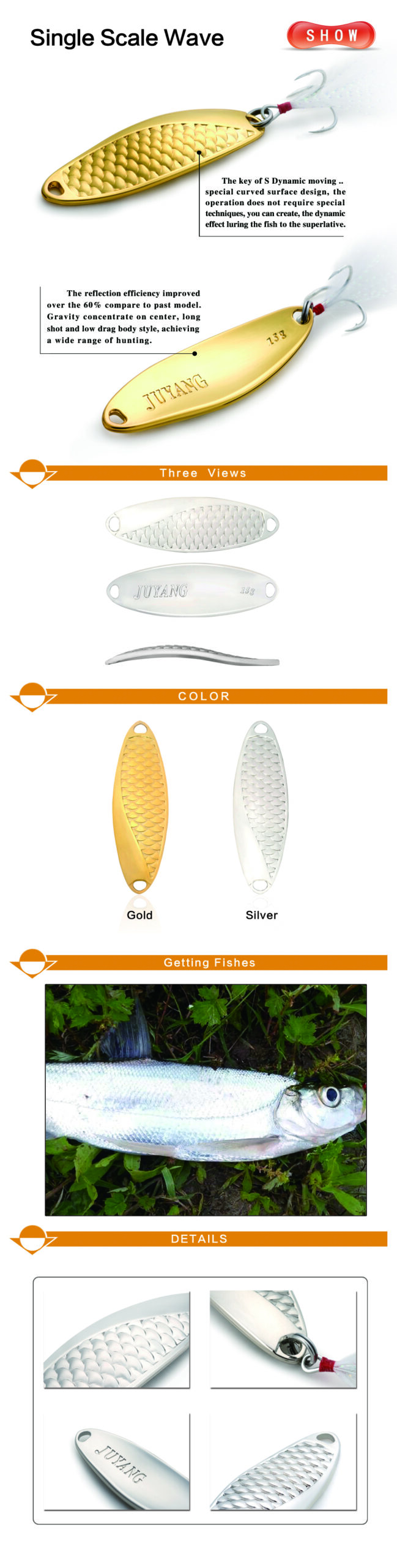 Single Scale Wave blizgės paviršius gerai atspindi šviesą ir labiau vilioja žuvis. Blizgės forma leidžia blizgei patraukliai judėti vandenyje tiek traukiant greitai tiek lėtai. Ši blizgė turėtų būti kiekvieno žvejo masalų dėžutėje.