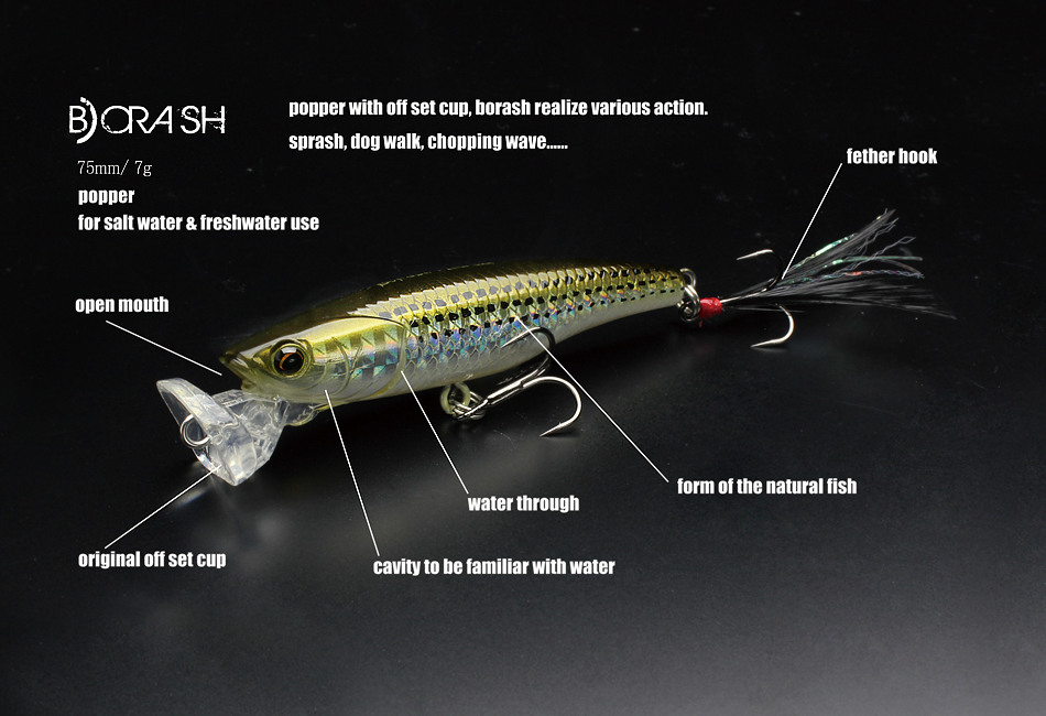 Borash yra neįtikėtinai gyvas masalas su išoriniu priekinio Popper puodelio veidu.  Japonijos įmonė Little Jack “poperius” perkėlė į naują lygį. Jei bandote gaudyti žuvis medžiojančias vandens paviršiuje, tada tai yra masalas kurio norite. “Veidas” arba “taurė” yra tuščia ir leidžia vandenį paleisti per ir atgal iš žiaunų. Borash “popper” sukelia daug purslų ir gražų burbulų taką. Borash sveria 7g ir yra 75mm ilgio.
