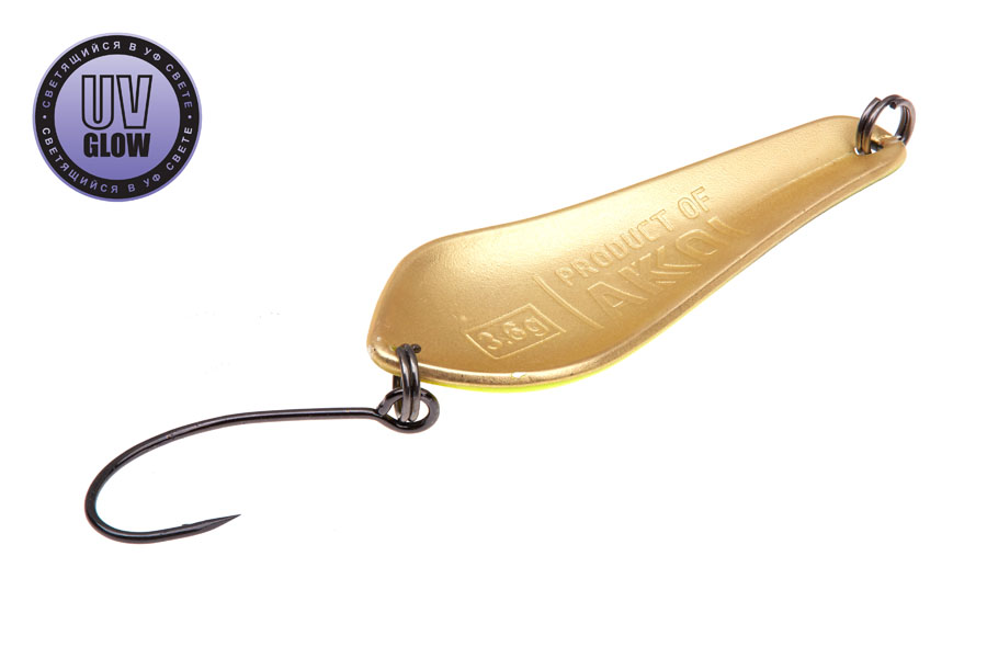 Vartiklės svoris – 3,6g, ilgis 40mm, plotis 15mm. Blizgutės pagamintos iš 1mm storio žalvario, su Mustad kabliuku. Šviečia UV šviesoje