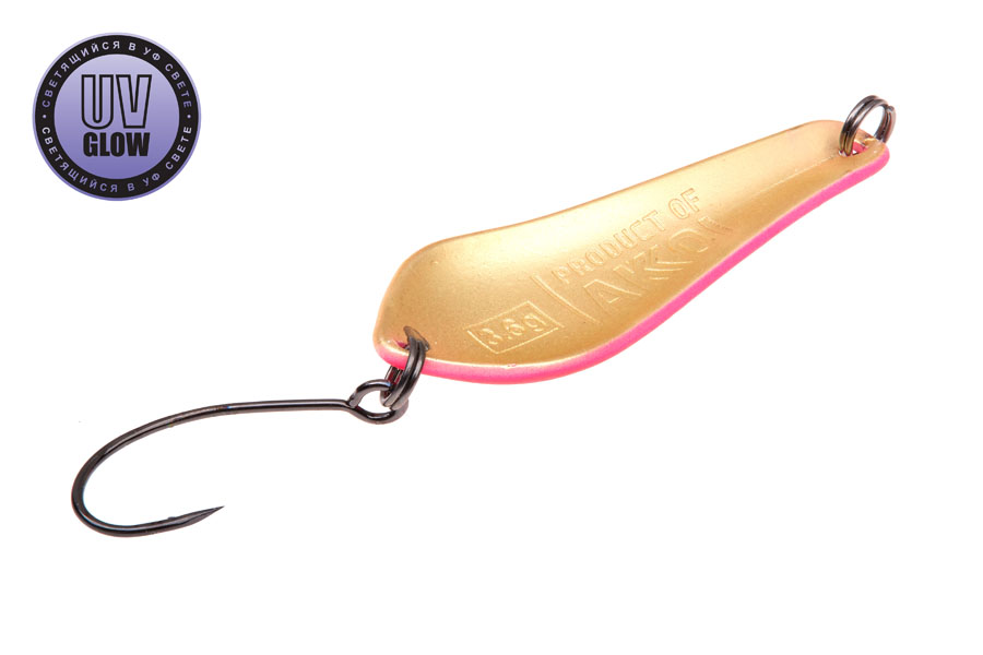 Vartiklės svoris  – 3,6g, ilgis 40mm, plotis 15mm. Blizgutės pagamintos iš 1mm storio žalvario, su Mustad kabliuku. Šviečia UV šviesoje