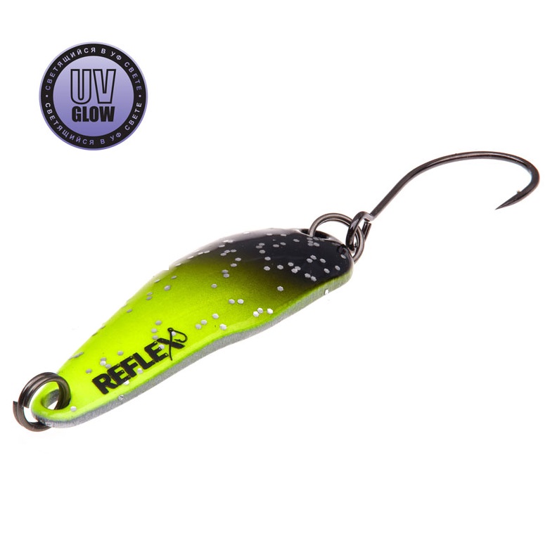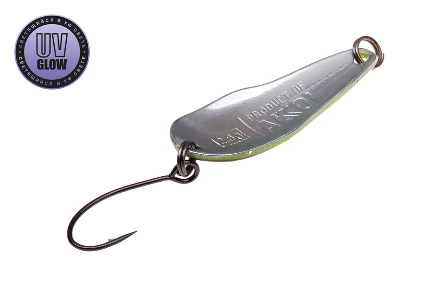 Vartiklės svoris – 2,6g, ilgis 32mm, plotis 12mm. Blizgutės pagamintos iš 1mm storio žalvario, su Mustad kabliuku. Šviečia UV šviesoje