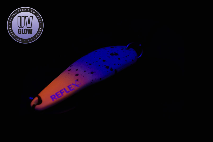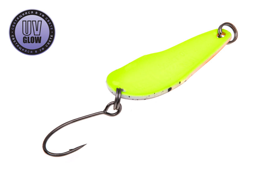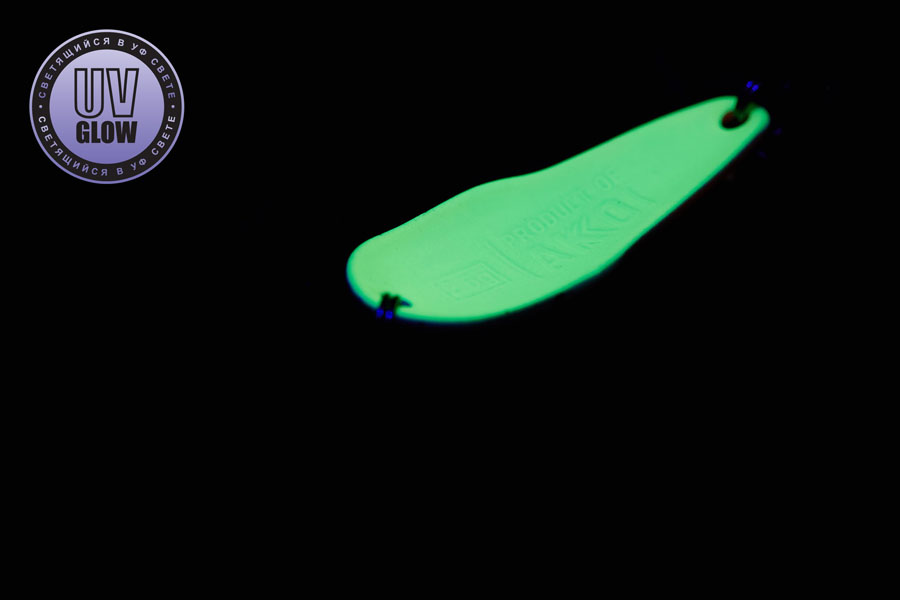 Vartiklės svoris  – 2,6g, ilgis 32mm, plotis 12mm. Blizgutės pagamintos iš 1mm storio žalvario, su Mustad kabliuku. Šviečia UV šviesoje