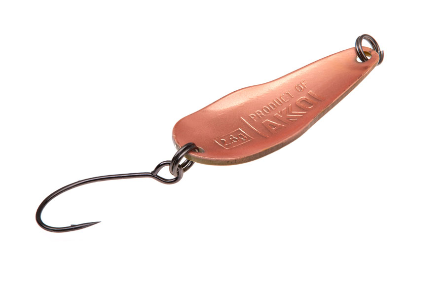 Vartiklės svoris – 2,6g, ilgis 32mm, plotis 12mm. Blizgutės pagamintos iš 1mm storio žalvario, su Mustad kabliuku.