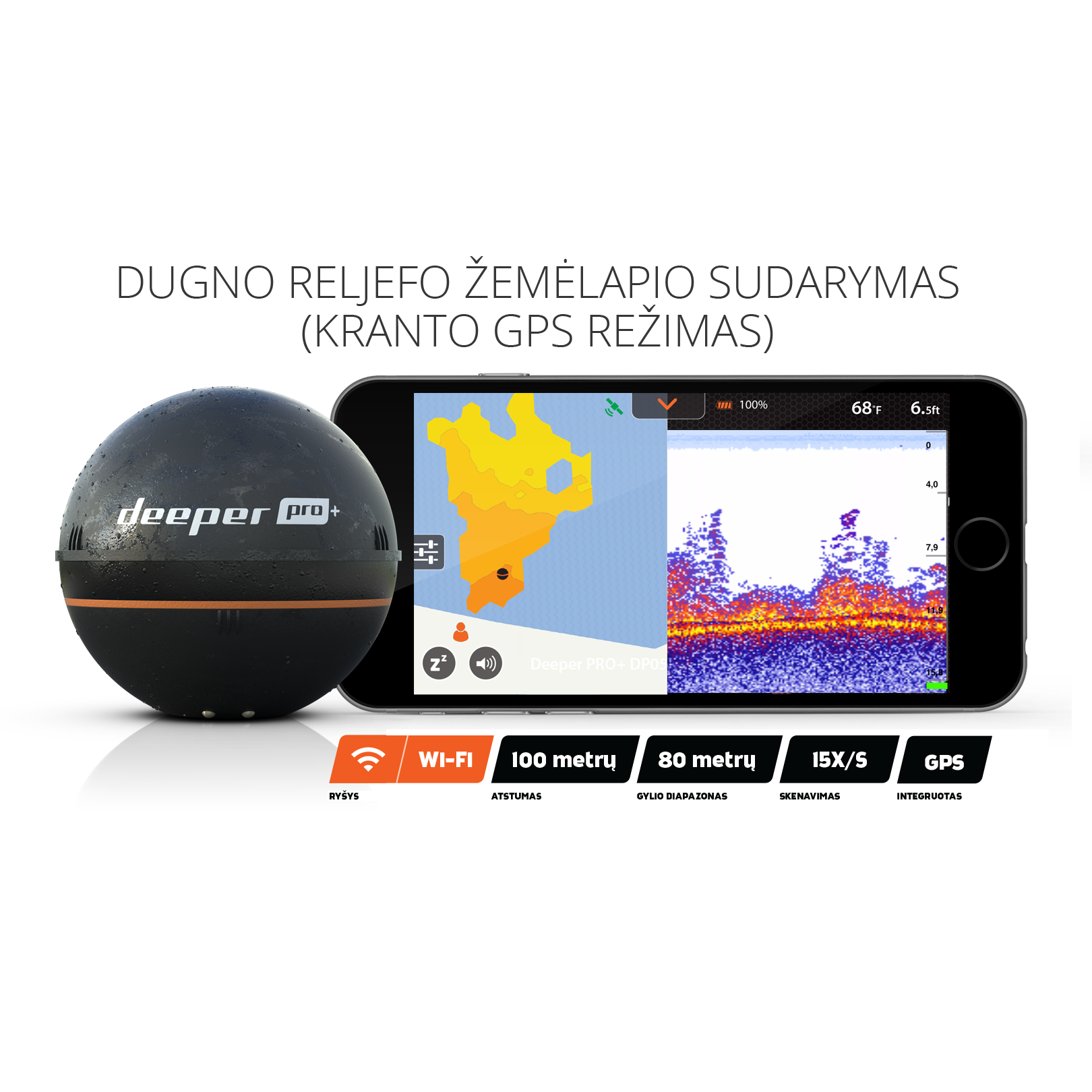 Deeper Smart Pro+ yra vienintelis tokio tipo echolotas pasaulyje su GPS moduliu. Deeper PRO+ skenavimų pagrindu batimetrinius planus galite sudaryti bet kada: ar žvejotumėte iš valties, ar nuo kranto, ar nuo ledo. Kai jūsų rankose yra PRO serijos echolotas, ir žvejyba bus kur kas profesionalesnė.