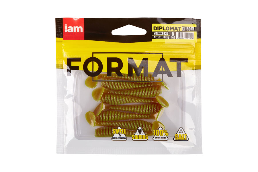 Diplomat 5cm F22 – yra universalus masalas, kurį galima naudoti bet kokioms žvejybos sąlygoms. Guminukas turi savybes, būdingas daugeliui šios klasės masalų: briaunuotas tankus kūnelis, siaura uodega ir platus „kulnas”. Ši masalo forma suteikia labai patrauklų ir gyvą žaidimą. Didelis „kulnas” atskleidžia „masalui žaidimą su galingomis vibracijomis, kuris padidina plėšrūnų masalo matomumą. Masalo judesių stabilumo netrikdo net stipri srovė. Guminuką galite animuoti bet kokiu būdu. Masalas yra lėtai skęstantis masalas. Tai leidžia naudoti masalą silikoną įvairiausiems žvejybos būdams.