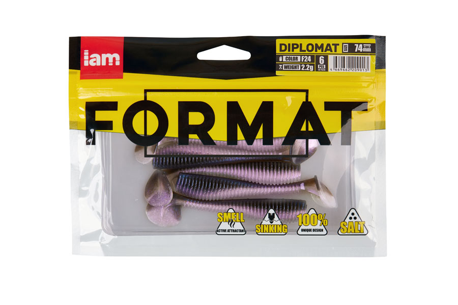 Diplomat 7.4cm F24 – yra universalus masalas, kurį galima naudoti bet kokioms žvejybos sąlygoms. Diplomatas turi savybes, būdingas daugeliui šios klasės masalų: briaunotas tankus kūnelis, siaura uodega ir platus „kulnas”. Ši masalo forma suteikia labai patrauklų ir gyvą žaidimą. Didelis „kulnas” atskleidžia „Diplomat” žaidimą su galingomis vibracijomis, kuris padidina plėšrūnų masalo matomumą. Masalo judesių stabilumo netrikdo net stipri srovė. Guminuką galite animuoti bet kokiu būdu. „Akkoi Diplomat” yra lėtai skęstantis masalas. Tai leidžia naudoti masalą įvairiausiems žvejybos būdams.