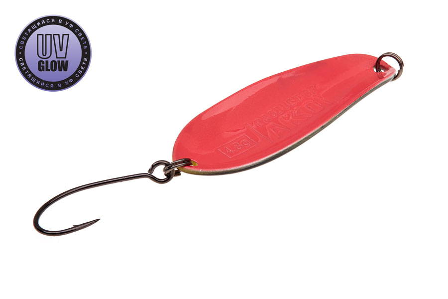 Vartiklės svoris – 4.8g, ilgis 42mm, plotis 16mm. Blizgutės pagamintos iš 1mm storio žalvario, su Mustad kabliuku. Šviečia UV šviesoje.