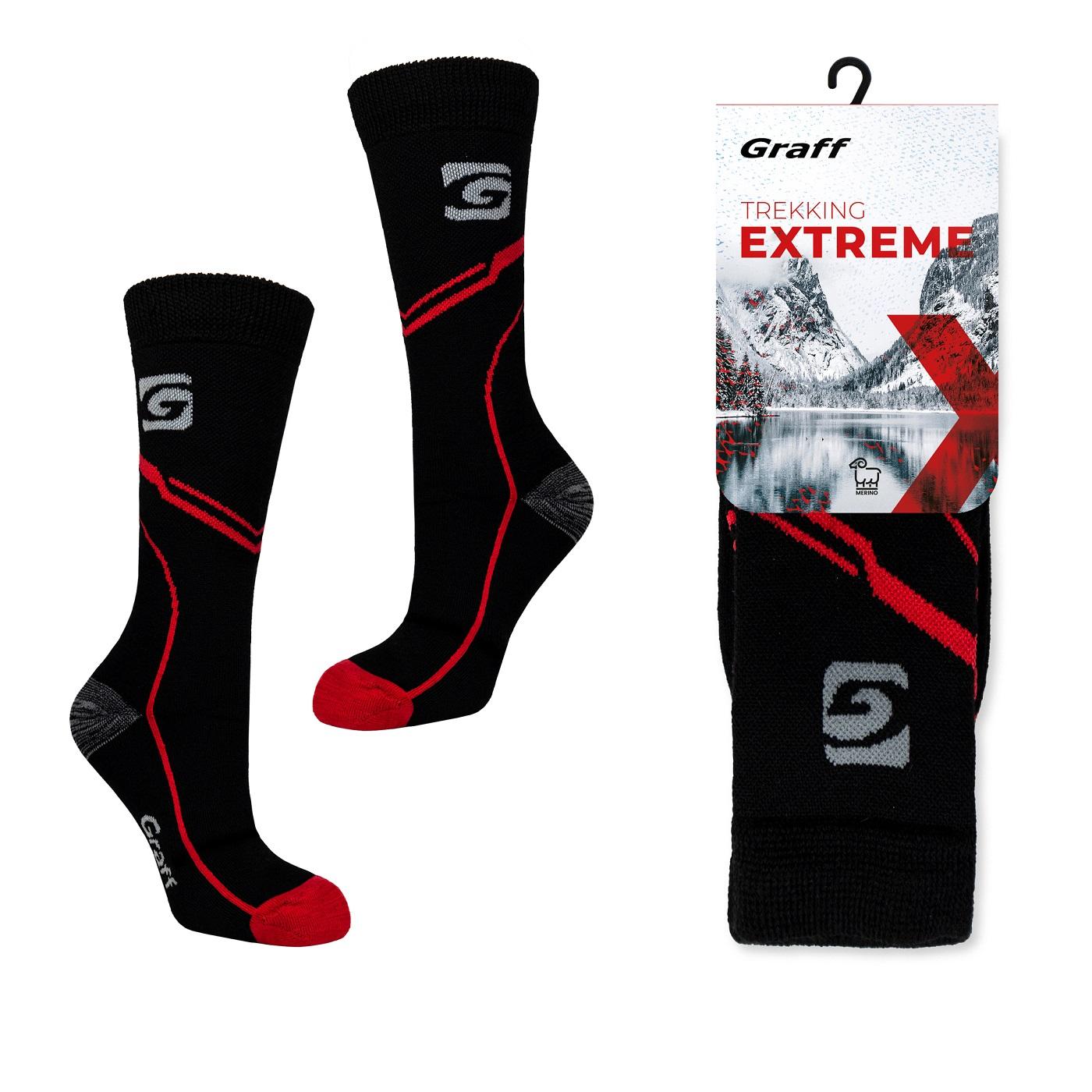 Merino Trekking Extreme 061 – Graff kojinės, skirtos ilgalaikiam naudojimui ekstremaliomis oro sąlygomis, labai žemoje temperatūroje. Zoninė struktūra garantuoja labai gerą pėdos smūgių sugėrimą, apsaugodama achilo sausgyslę ir visą pėdą. Specialiai parinkta gamybos sudėtis yra atsakinga už puikias šilumos izoliacijos savybes. Priemonė garantuoja drėgmės nunešimą į kojinės išorę, taip užtikrindama tinkamą oro cirkuliaciją ir ilgalaikį sausumo jausmą. Dėka sidabro jonų įgyvendinimo ir Merino vilnos naudojimo, kojinės efektyviai stabdo bakterijų, grybelių ir pelėsių dauginimąsi – taip sumažinamas nemalonaus kvapo susidarymas.