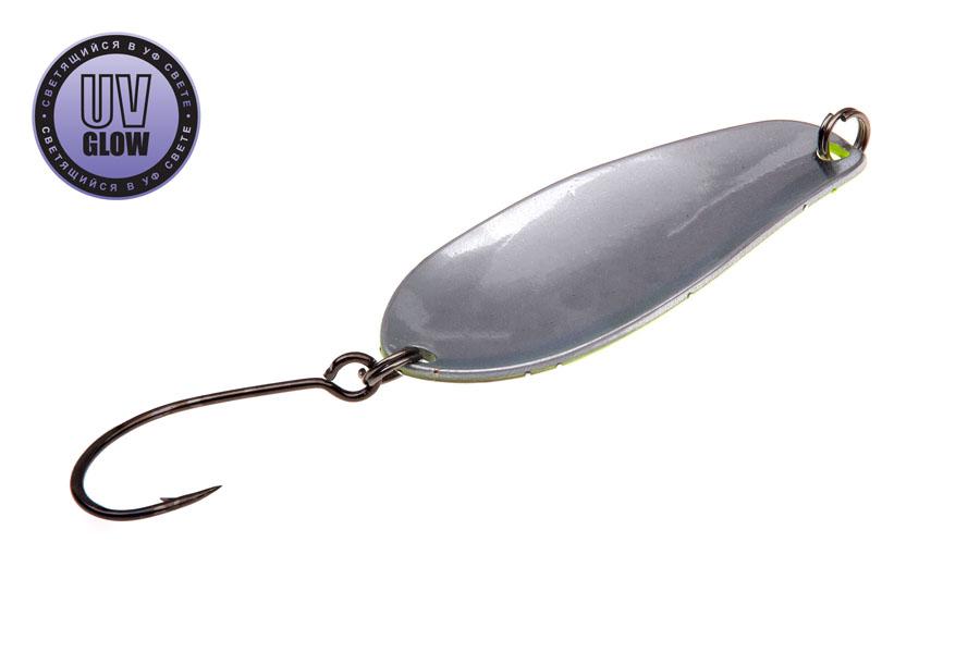 Vartiklės svoris  – 4.8g, ilgis 42mm, plotis 16mm. Blizgutės pagamintos iš 1mm storio žalvario, su Mustad kabliuku. Šviečia UV šviesoje