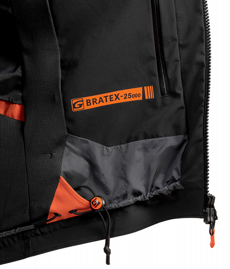 • 3 sluoksnių BRATEX® membrana su vandeniui atsparia ir kvėpuojančia parametrais 25 000 mm H2O / 20 000 g / m2 / 24 val.