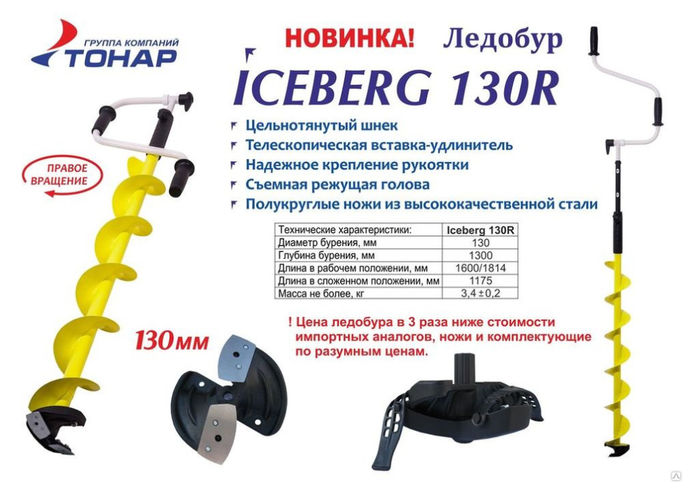 Iceberg euro 130R mini – jau spėtas pamėgti poledinės žūklės gerbėjų. Šis dvirankis grąžtas Tonar yra pagamintas Rusijoje ir vienas iš lengviausių ir kompaktiškiausių grąžtų gamintojo asortimente. Gręžimo kryptis pagal laikrodžio rodyklę. Šis grąžtas turi greitą rankenos užfiksavimo mechanizmą. Grąžto peiliai pagaminti iš labai aukštos kokybės plieno, todėl be vargo prigręšite skylių tiek kiek reikia. Grąžtas – dvirankis, tinkamas gręžti tiek sausą, tiek šlapią ledą, grąžto rankenėlės guminės, todėl rankos nešals gręžiant. Gražto darbinė dalis yra prailginta. Rankenos ilgį galima reguliuoti nuo 1070 – 1370 mm. Komplekte du peiliukai šlapiam ledui ir raktas jiems pakeisti.