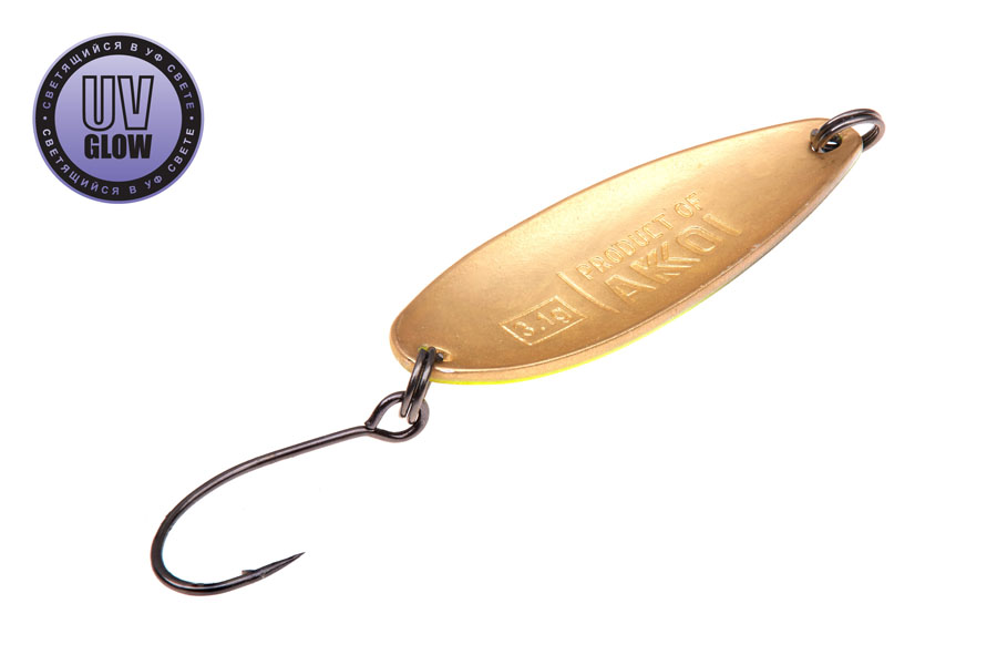 Blizgutės ilgis 35mm, plotis 13mm, svoris 3,1gr. Mustad kabliukai. Pagamintos iš 1mm storio žalvario. Šviečia UV šviesoje