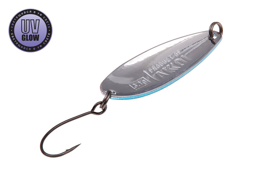 Blizgutės ilgis 35mm, plotis 13mm, svoris 3,1gr. Mustad kabliukai. Pagamintos iš 1mm storio žalvario. Šviečia UV šviesoje