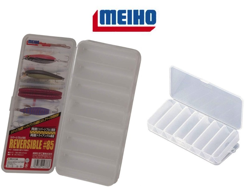 Reversible 85 – dvipusė dėžutė, abi pusės skaidraus plastiko, todėl lengvai pasirinksite savo norimą masalą. MEIHO Reversible dėžutės yra skirtos iki 80 mm ilgio vobleriams, kita vertus kuo puikiausiai tiks ir vartiklėms ar sukrėms. MEIHO dėžutės iš daugelio kitų gamintojų išsiskiria būtent savo kokybe, nelyginant kitų gamintojų, todėl tarnauja ypač ilgai ir puikiai patiks bet kuriam žvejui.