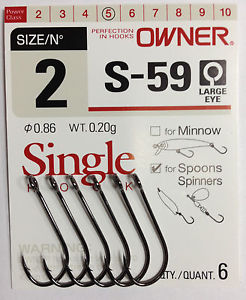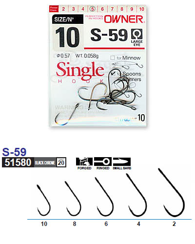S-59 Owner gamintojo vienšakiai kabliukai su didele akute. Šie kabliukai yra skirti jig tipo masalams – įvairioms gumoms, sukriukėms ar UL blizgutėms. Dėka didelės auselės šiuos kabliukus lengva prisegti prie spynelės ar reikalui esant greitai ir be vargo atkabinti.