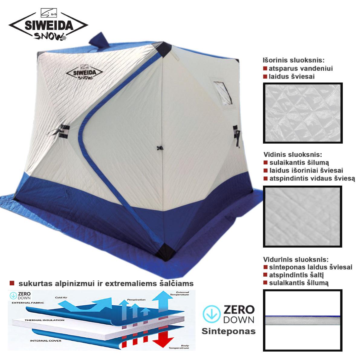Siweida Kubas 240x240x210 – pašiltinta, trijų sluoksnių palapinė. Palapinė sukurta alpinizmui ir ekstramaliems šalčiams.