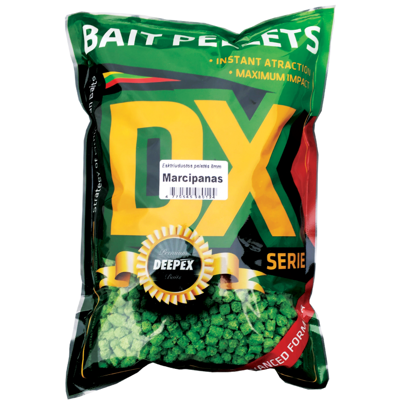 Deepex Peletės 8mm marcipanas – ekstriuduotos peletės skirtos žūklavietės jaukinimui. Tai granuliuotas prievilas jaukinanti žūklavietę karpiams, karšiams, lynams, karosams.