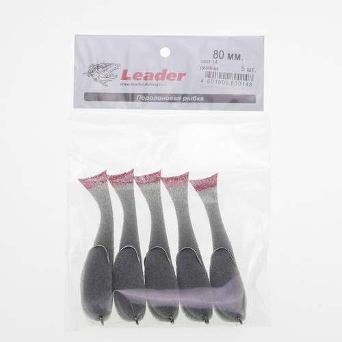 Leader poroloninė žuvelė #14 – su dvišakiu kabliuku. Žuvies kūnas yra juodas , raudona uodega.