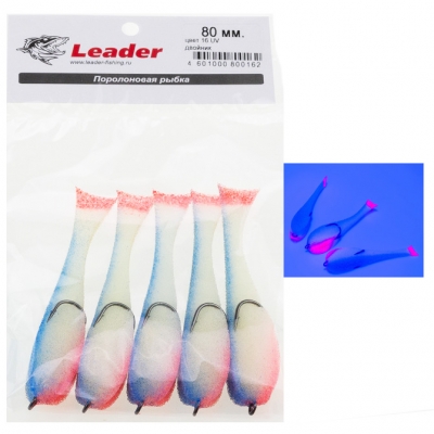 Leader poroloninė žuvelė #16UV – su dvišakiu kabliuku. Žuvies kūnas yra baltas, mėlyna galinė dalis UV, pilvas raudonas ir uodega – UV
