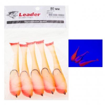 Leader poroloninė žuvelė #16UV – su dvišakiu kabliuku. Žuvies kūnas yra baltas, oranžinė nugara UV , pilvas raudonas ir uodega – UV