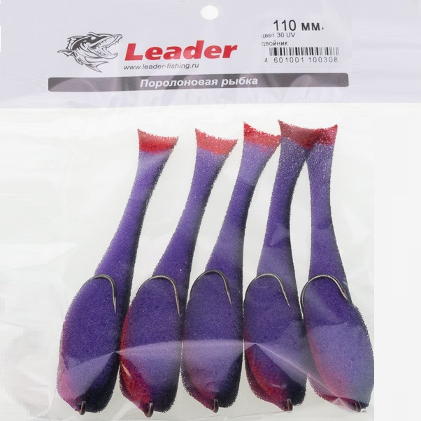 Leader poroloninė žuvelė #30 – su dvišakiu kabliuku. Žuvies kūnas yra violetinis, juodaė nugara , raudonas UV uodega.