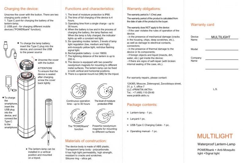 4. 6 darbo režimai: žibintas, 3 lempų pritemdymo lygiai (žemas, vidutinis ir aukštas), uodų lemputė, raudonai mėlyna mirksi įspėjamoji lemputė.