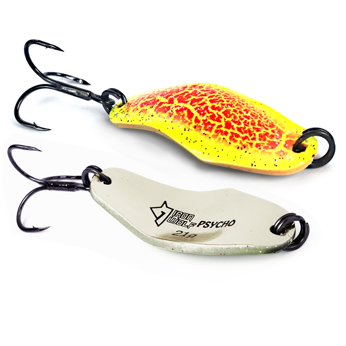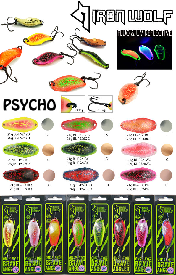 Psycho YO – Iron Wolf blizgės yra sukurtos lašišoms, bet patinka ir lydekoms. Blizgės tik pasiteisinusiomis spalvomis, bei optimalaus svorio. Šviečia ultravioletinėje šviesoje  UV, fosforo spalvinimas. Masalai su tvirtais komponentais (žiedeliai atlaiko 60kg, kabliukai 40kg apkrovas).