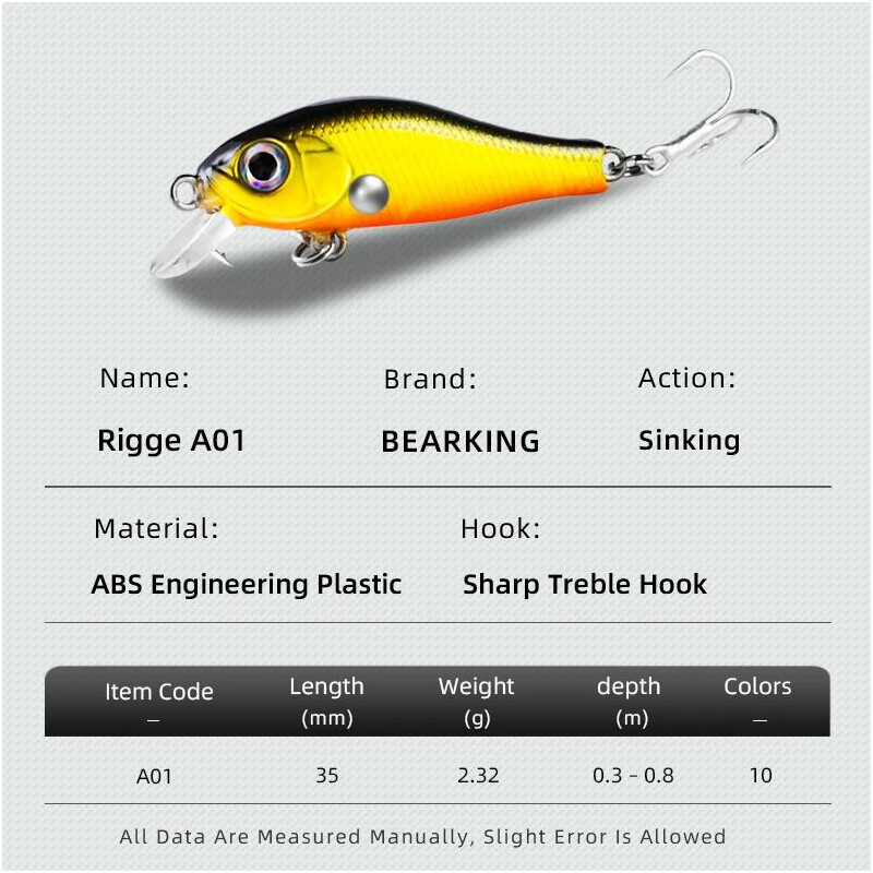 RiggeA 35S A01 F – tai kokybiška ir gerokai pigesnė japoniško Zipbaits Rigge 35S replika. Šis mažas vobleriukas savo viduje esančio judančio svarelio dėka, pasižymi puikiomis balistinėmis savybėmis, užtikrintu darbu vandenyje, ir puikiu balansu traukiant tiek pasroviui, tiek prieš srovę. Dėl savo nedidelio dydžio ir smulkesnio darbo jis puikiai pasiteisina tais atvejais, kai šapalai dar nenoriai reaguoja į agresyvesnių crank tipo masalus. Ešeriai, meknės ir upėtakiai taip pat neatsispiria jo darbui ir spalvinei gamai.