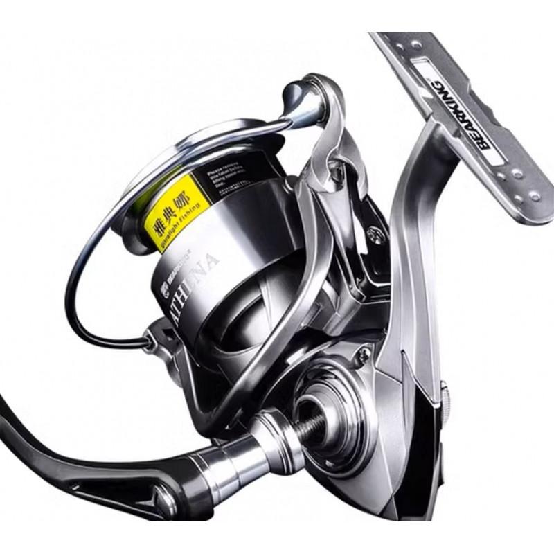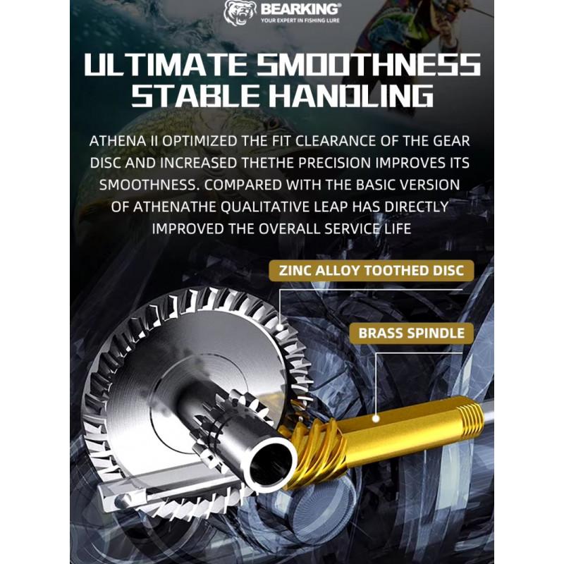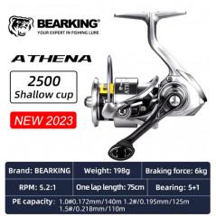 Bearking Athena AD-2500 – tai atnaujintas Athena serijos modelis kuris pirmiausia stebina savo svoriu. Taip ši ritė savo 2500 dydžio korpuse yra lengvesnė už keletą kartų brangesnius Shimano modelius, tokius kaip Nasci, Miravel, Ultegra ir net Stradic. Tai lemia gamyboje naudojamos aliuminio bei anglies pluošto medžiagos. Kaip ir lengviausioje Bearking ZEUS II 1500 ritėje taip ir čia turime įsukamą anglies pluošto rankenėlę kuri ne tik lengvumo, bet ir išvaizdos prasme prideda solidumo. Rekomenduojame šią ritę rinktis lengvesnėms „ultralight” žvejyboms. Pati ritė pasižymi sklandžiu ir švelniu darbu.